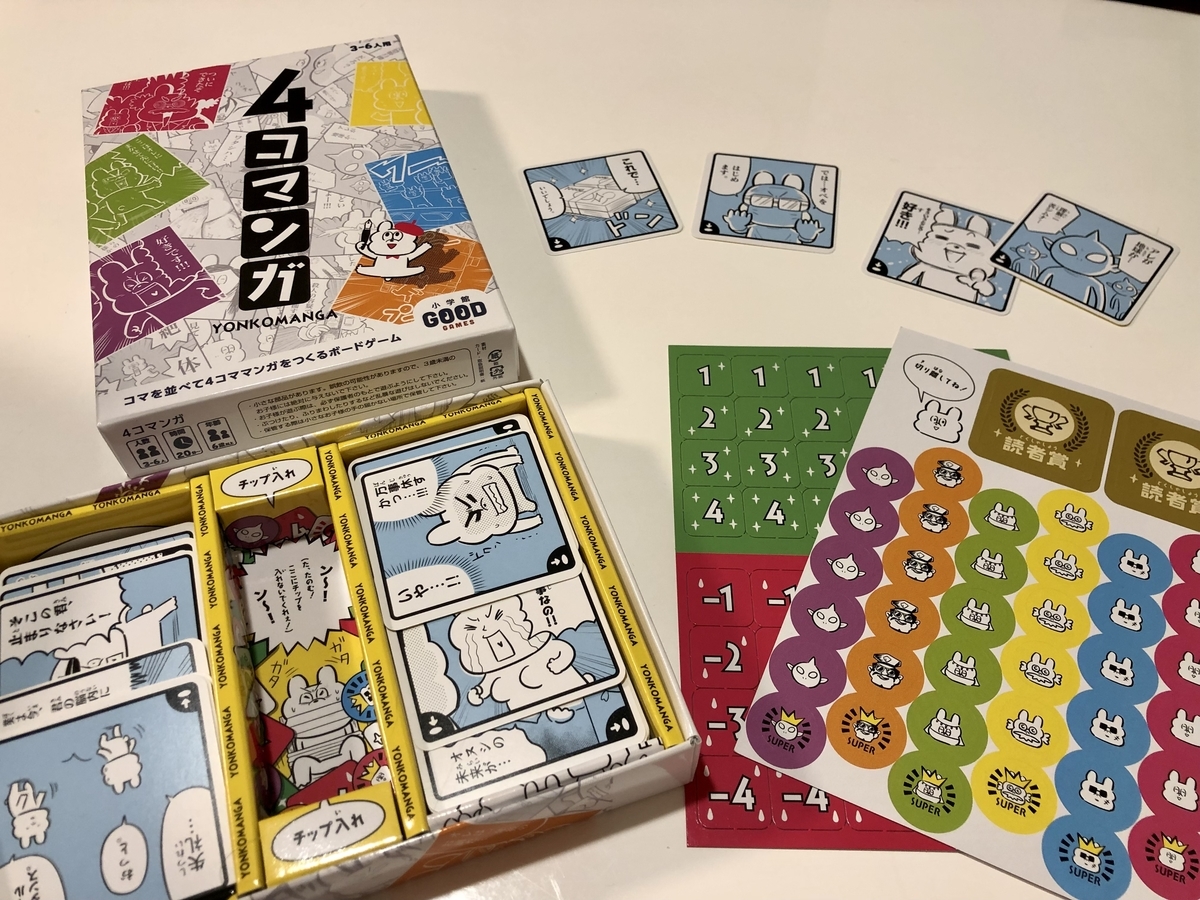 「4コマンガ」は小学館から発売されているカードゲームで、プレイヤーが1枚ずつマンガのコマを出して4コママンガを作り読者役プレイヤーの評価によってポイントをゲットしていくというゲームです。