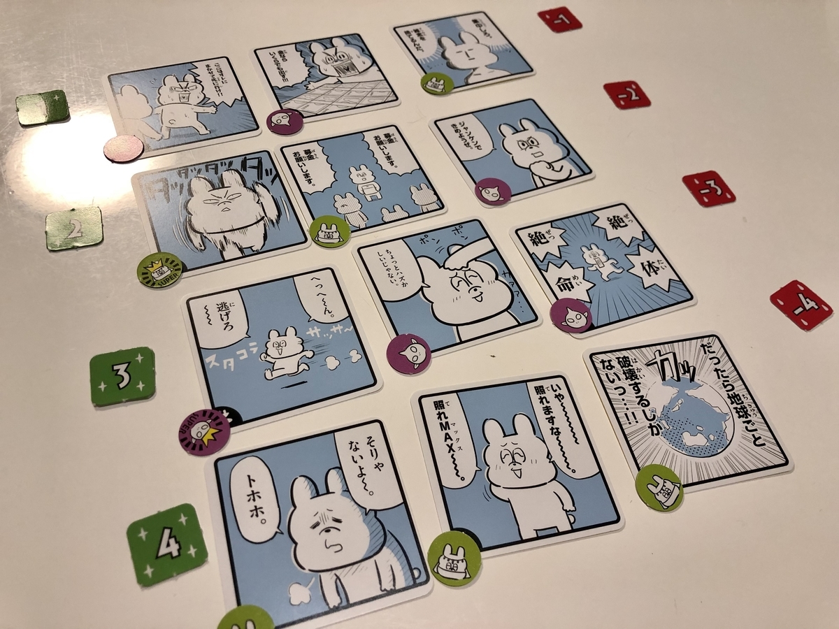 また、完成したマンガの中から、読者役のプレイヤーが得点ゲットできる面白いマンガとマイナスになってしまうイマイチなマンガを選ぶので、読者役によって評価が分かれるのも面白いです。